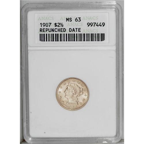 <B>1907<$2 1/2> MS63 ANACS.</B></I> Repunched Date. Breen-6329. The 7 displays prominent repunching, especially at the lower tip. Select and solidly struck with lustrous wheat-gold surfaces that turn to orange-gold at the periphery.
