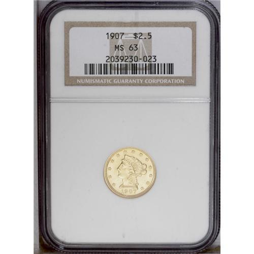 <B>1907<$2 1/2> MS63 NGC.</B></I> Flashy luster is complemented by well executed design elements. Some small contact marks on Liberty's cheek and neck and in the fields prevent an even higher grade. An exceptional Liberty quarter eagle for the grade. <BR><BR><B>Important notice:</B> Heritage usually auctions material at the rate of 200-250 lots per hour. On some occasions eBay Live bid software or the Internet may not be able to keep up with the pace of the auction. We recommend placing a realistic absentee bid now as insurance to avoid disappointment. Occasionally the auctioneer may eliminate or reject an eBay Live bid, and the auctioneer may also reopen a lot after the close of the eBay live bidding (usually because we missed an audience bid), and may reject your bid even if it shows you as the winning bidder. By bidding via eBay Live, you agree that Heritage may award the lot to another bidder at its sole discretion under the circumstances described above or any other reasonable circumstances. Since eBay bids are not shown to us until we open the lot on the floor, we treat those bids just like floor bids. In most cases the floor responds before the eBay bid is presented to us, due to Internet lag time, so for consistency we have made it a policy that floor bids are always considered first over tie eBay live bids. Also please note that all Heritage lots purchased through eBay Live carry a 20% Buyer's Premium. Please make sure you read the Terms and Conditions before you bid. This lot is being auctioned in conjunction with a live floor auction by Heritage Galleries & Auctioneers. All final auction and invoice information will be supplied by Heritage Galleries & Auctioneers, and all other information should be considered preliminary. Lot:2457 <BR><BR><B>Winning Notification and Billing:</B> After the FINAL session in this auction is complete, Heritage will send e-mail and snail mail invoices. This process normally takes several days. All final auction and invoice information will be supplied by Heritage Galleries & Auctioneers, and all other information should be considered preliminary. <BR><BR>This auction will be conducted on a live auction floor and over the Internet through eBay Live. If you choose to place an absentee bid, please take a moment to <font color='#0000ff'><u><a href='http://pages.ebay.com/liveauctions/help/before/laabsentee.html'>learn how eBay Live absentee bidding works</a></u></font><font color='#000000'>