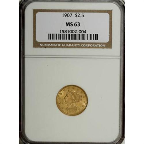 <B>1907 $2 1/2 MS63 NGC.</B></I> NGC Census: (1379/2611). PCGS Population (2216/2887). Mintage: 336,200. Numismedia Wsl. Price for NGC/PCGS coin in MS63: $725. (#7859)<BR><BR><B>Coin Engraver:</B> Christian Gobrecht<BR><BR><b>Shipping:</b> Coins & Currency (<a target="_blank" href="http://www.heritageauctions.com/common/shipping.php">view shipping information</a>)