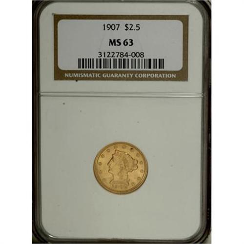 <B>1907 $2 1/2 MS63 NGC.</B></I> NGC Census: (1427/2709). PCGS Population (2270/3055). Mintage: 336,200. Numismedia Wsl. Price for NGC/PCGS coin in MS63: $1,140. (#7859)<BR><BR><B>Coin Engraver:</B> Christian Gobrecht<BR><BR><b>Shipping:</b> Coins & Currency (<a target="_blank" href="http://www.heritageauctions.com/common/shipping.php">view shipping information</a>)