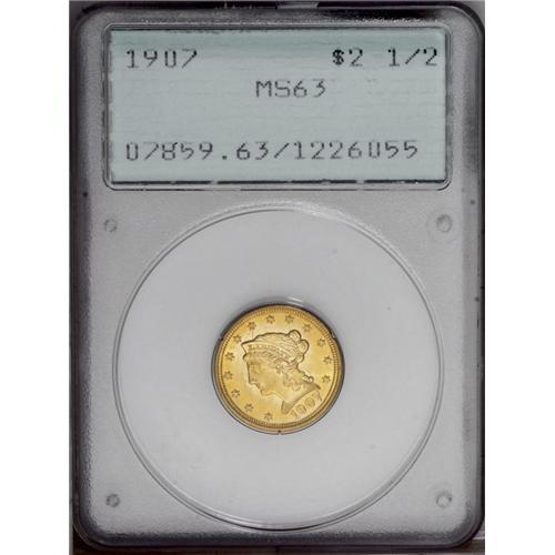 <B>1907<$2 1/2> MS63 PCGS.</B></I> A pinpoint-sharp orange-red representative with attractive surfaces for the conservatively assessed grade. Housed in a first generation holder.