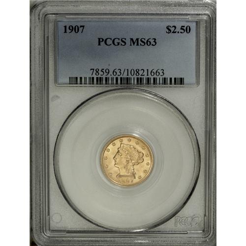 <B>1907 $2 1/2 MS63 PCGS.</B></I> Solidly struck with shining lemon-yellow surfaces. A number of tiny marks pepper the fields, though none of these are individually distracting.<BR><BR><b>Shipping:</b> Coin/Currency (<a target="_blank" href="http://www.heritageauctions.com/common/shipping.php">view shipping information</a>)