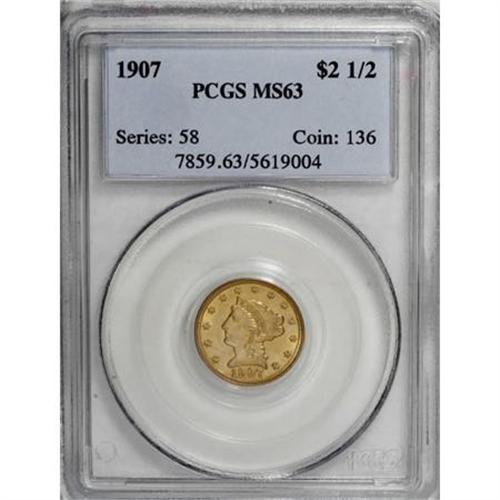 <B>1907 $2 1/2 MS63 PCGS.</B></I> PCGS Population (2207/2862). NGC Census: (1367/2591). Mintage: 336,200. Numismedia Wsl. Price for NGC/PCGS coin in MS63: $730. (#7859)<BR><BR><B>Coin Engraver:</B> Christian Gobrecht<BR><BR><b>Shipping:</b> Coins & Currency (<a target="_blank" href="http://www.heritageauctions.com/common/shipping.php">view shipping information</a>)