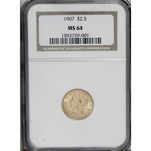 <B>1907 $2 1/2 MS64 NGC.</B></I> Choice and highly lustrous, this yellow-orange piece has well-defined devices on both sides. A red copper spot appears at 8 o'clock on the obverse, and several dark areas are visible near 2 o'clock on the reverse.<BR><BR><b>Shipping:</b> Coin/Currency (<a target="_blank" href="http://www.heritageauctions.com/common/shipping.php">view shipping information</a>)