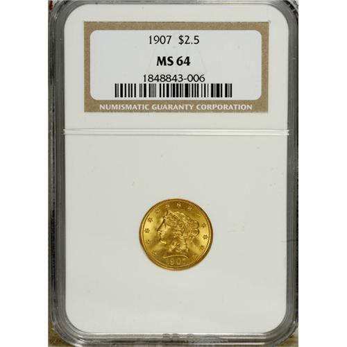 <B>1907 $2 1/2 MS64 NGC.</B></I> Fully lustrous surfaces exhibit pretty peach-gold color laced with tints of light green. Some minor obverse contact marks and luster grazes limit the grade.<BR><BR><b>Shipping:</b> Coins & Currency (<a target="_blank" href="http://www.heritageauctions.com/common/shipping.php">view shipping information</a>)