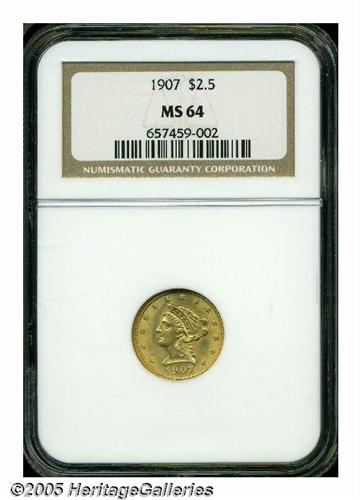 <B>1907<$2 1/2> MS64 NGC.</B></I> Highly lustrous and sharply struck with exceptional eye appeal. This Choice Mint State example is an excellent candidate for the date specialist or type collector.