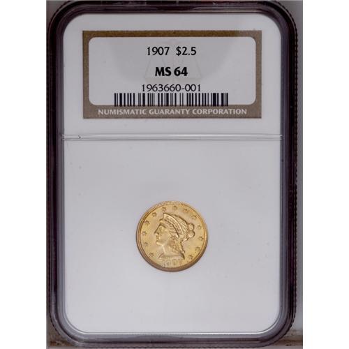 <B>1907<$2 1/2> MS64 NGC.</B></I> This lustrous and pinpoint-sharp near-Gem has smooth surfaces and luminous honey-gold patina. A charming final-year type coin.