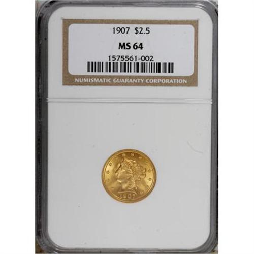 <B>1907 $2 1/2 MS64 NGC.</B></I> NGC Census: (1483/1096). PCGS Population (1752/1113). Mintage: 336,200. Numismedia Wsl. Price for NGC/PCGS coin in MS64: $960. (#7859)<BR><BR><B>Coin Engraver:</B> Christian Gobrecht<BR><BR><b>Shipping:</b> Coins & Currency (<a target="_blank" href="http://www.heritageauctions.com/common/shipping.php">view shipping information</a>\)