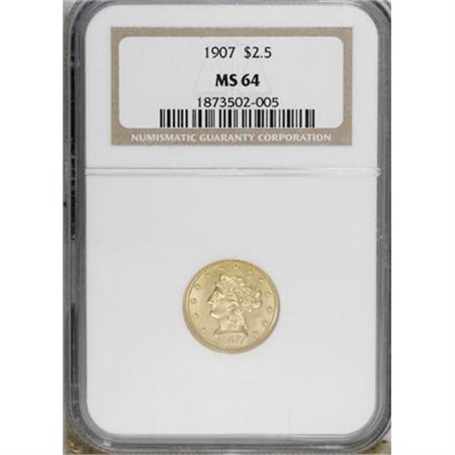 <B>1907 $2 1/2 MS64 NGC.</B></I> NGC Census: (1525/1111). PCGS Population (1814/1160). Mintage: 336,200. Numismedia Wsl. Price for NGC/PCGS coin in MS64: $1,080. (#7859)<BR><BR><B>Coin Engraver:</B> Christian Gobrecht<BR><BR><b>Shipping:</b> Coins & Currency (<a target="_blank" href="http://www.heritageauctions.com/common/shipping.php">view shipping information</a>)