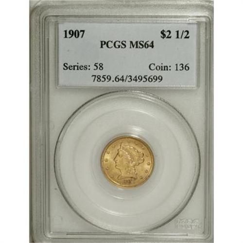 <B>1907 $2 1/2 MS64 PCGS.</B></I> Well struck with ample luster and pleasing coloration, this piece is unmarked and very close to Gem quality. Several specks of grayish verdigris adhere to some of the devices, and there is some purplish toning near the date. An attractive example of this final-year issue. <BR><I>From The Vanek Collection.</B></I><BR><BR><b>Shipping:</b> Coins & Currency (<a target="_blank" href="http://www.heritageauctions.com/common/shipping.php">view shipping information</a>)