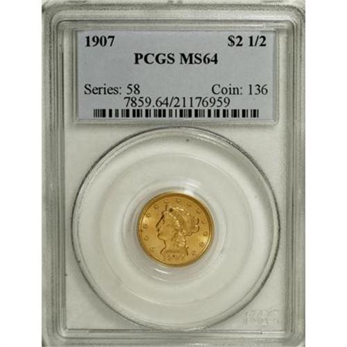 <B>1907 $2 1/2 MS64 PCGS.</B></I> The base of the 7 in the date is repunched. This sun-gold near-Gem has vibrant luster and a precise strike. A small gray spot is noted on the L in LIBERTY.<BR><BR><b>Shipping:</b> Coins & Currency (<a target="_blank" href="http://www.heritageauctions.com/common/shipping.php">view shipping information</a>)