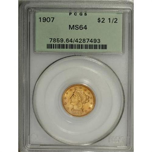 <B>1907 $2 1/2 MS64 PCGS.</B></I> . PCGS Population (1846/1186). NGC Census: (1564/1131). Mintage: 336,200. Numismedia Wsl. Price for NGC/PCGS coin in MS64: $1,360. (#7859)<BR><BR><B>Coin Engraver:</B> Christian Gobrecht<BR><BR><b>Shipping:</b> Coins & Currency (<a target="_blank" href="http://www.heritageauctions.com/common/shipping.php">view shipping information</a>)