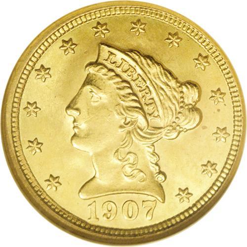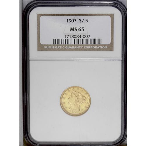 <B>1907<$2 1/2> MS65 NGC.</B></I> Flashy luster underlies copper-gold patina. Just a couple of light marks prevent a higher grade. The strike is, as always, free of criticism on this ideal type coin.