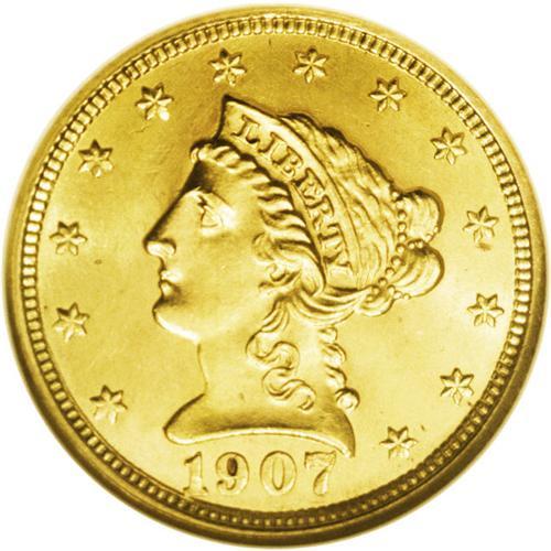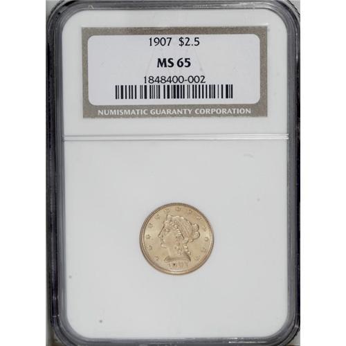 <B>1907<$2 1/2> MS65 NGC.</B></I> This intricately struck final year type coin features potent luster and suitably smooth fields. Liberty's cheek and neck are unusually free from marks. Medium honey-gold toning contributes further to the eye appeal. The dentils on the left reverse border are broadly strike doubled.