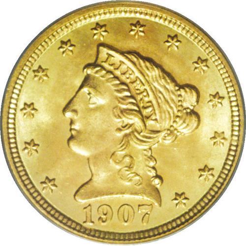 <B>1907 $2 1/2 MS65 PCGS.</B></I> A lustrous and sharply struck Gem with refreshingly unperturbed fields and devices. The apricot centers and green-gold margins are typical of original gold coins from this era. Unlike often seen, there is no repunching on the base of the 7 in the date. Encapsulated in a green label holder.<BR><BR><b>Shipping:</b> Coin/Currency (<a target="_blank" href="http://www.heritageauctions.com/common/shipping.php">view shipping information</a>)
