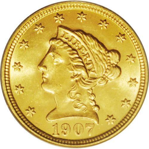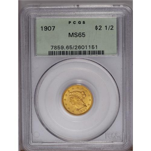 <B>1907 $2 1/2 MS65 PCGS.</B></I> A sharply struck final year issue that possesses full, satiny luster under swirling golden-orange patina and shows virtually no distracting blemishes on either side.
