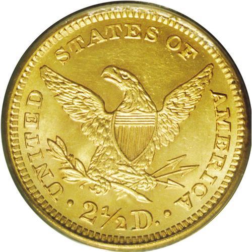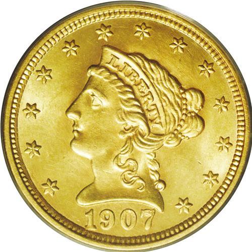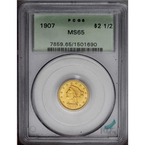 <B>1907<$2 1/2> MS65 PCGS.</B></I> This flashy peach-gold Gem is intricately struck throughout aside from a few left side dentils. A couple of hair-thin obverse slide marks will be missed by all but the most careful observers. The 17 in the date is lightly repunched. Encapsulated in a green label PCGS holder.<BR><I>From The Sandia Mountain Collection.</B></I>