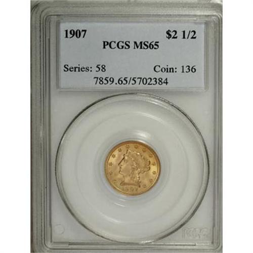 <B>1907 $2 1/2 MS65 PCGS.</B></I> Boldly impressed with strong, swirling luster befitting this coin's Gem status. Satiny orange-gold surfaces show occasional elements of peach and emerald.<BR><BR><B>Coin Engraver:</B> Christian Gobrecht<BR><BR><b>Shipping:</b> Coins & Currency (<a target="_blank" href="http://www.heritageauctions.com/common/shipping.php">view shipping information</a>)
