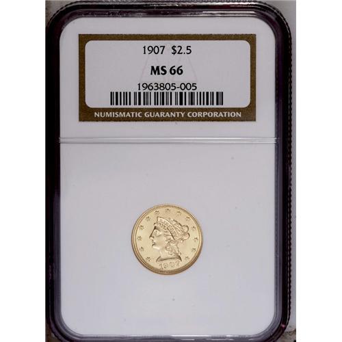 <B>1907<$2 1/2> MS66 NGC.</B></I> A sharply struck Premium Gem that has even yellow-gold coloration over surfaces that are free from any superficial distractions, including alloy spots. The strike is needle-sharp in all areas, and the rich endowment of frosty luster produces a pleasing flashy sheen from both sides. An important coin for the high grade type collector.