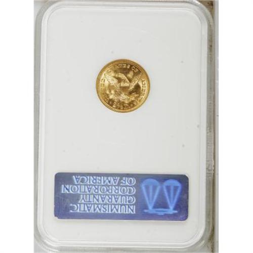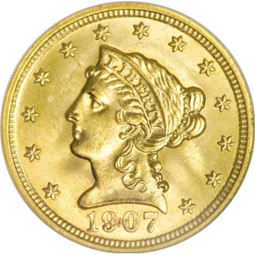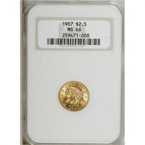 <B>1907 $2 1/2 MS66 NGC.</B></I> The satiny, orange-yellow surfaces are semiprooflike on this coin, with alternating areas of brilliance and satiny luster. The strike is nearly full, and there are no singular abrasions of any size to mar the considerable eye appeal. This issue is available for a price all the way up through MS67 and occasionally beyond.<BR><BR><B>Coin Engraver:</B> Christian Gobrecht<BR><BR><b>Shipping:</b> Coins & Currency (<a target="_blank" href="http://www.heritageauctions.com/common/shipping.php">view shipping information</a>)