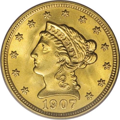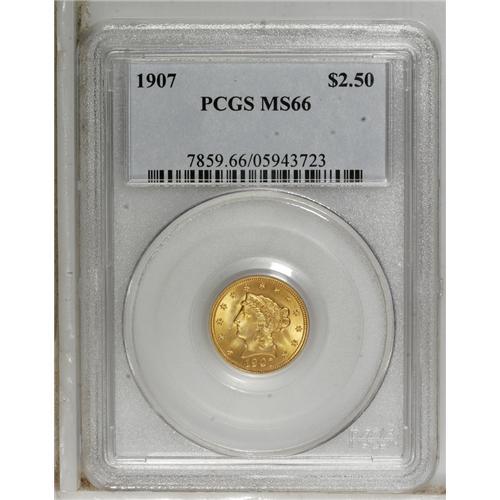 <B>1907 $2 1/2 MS66 PCGS.</B></I> Rich orange toning and potent luster provide pleasing eye appeal. The major devices are fully struck, and only the tips of a few denticles lack intricate detail. This final-year type coin is clean, since the fields have only a few delicate, hair-thin grazes.<BR><BR><b>Shipping:</b> Coins & Currency (<a target="_blank" href="http://www.heritageauctions.com/common/shipping.php">view shipping information</a>)