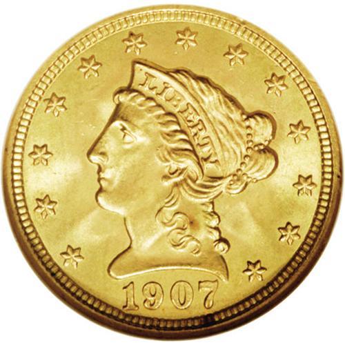 <B>1907<$2 1/2> MS67 NGC.</B></I> Although not at all a rare issue, this shimmering little jewel is about as pristine an example of the Liberty quarter eagle type as one could ever want or find. The surfaces are virtually perfect, the strike is razor sharp, and the eye appeal is simply stunning. The green-gold luster is intense on both sides, giving this piece overall eye appeal that is simply stunning. For pedigree purposes, a single reddish alloy spot is seen in the denticles below the 7 of the date. There may be a few examples of this issue with higher technical grades (four to be exact, one MS68 at PCGS and three MS68s at NGC), but none is likely to surpass this little beauty in aesthetic appeal. Census: 75 in 67, 3 finer (2/06).<BR><I>From The Sandia Mountain Collection.</B></I>