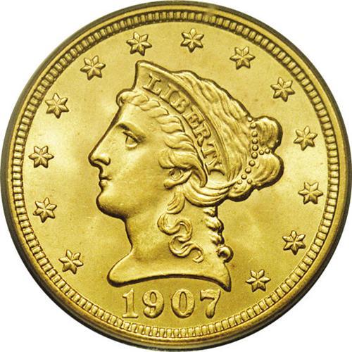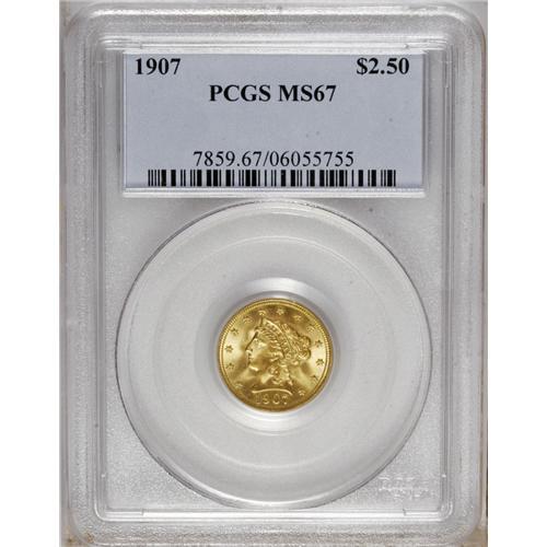 <B>1907<$2 1/2> MS67 PCGS.</B></I> Final year of the long-lived Coronet series of quarter eagles. This is a splendid type coin that is devoid of any mentionable or noticeable abrasions. The mint luster is bright and frosted. The impression is full at the peripheries but slightly soft in the centers, the only flaw we see on this magnificent coin.