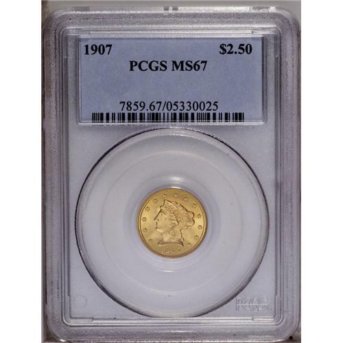 <B>1907<$2 1/2> MS67 PCGS.</B></I> This crisply struck yellow-gold example offers brilliant luster over essentially flawless surfaces, where any mention of quibbles would be to give them more attention than they merit. This Superb Gem is absolutely as fully detailed as anyone could wish for, showing a wealth of detail not normally seen on specimens that lack such a bold strike. Nearly unimprovable quality: PCGS has graded only a single example finer (3/06). <BR><BR><B>Important notice:</B> Heritage usually auctions material at the rate of 200-250 lots per hour. On some occasions eBay Live bid software or the Internet may not be able to keep up with the pace of the auction. We recommend placing a realistic absentee bid now as insurance to avoid disappointment. Occasionally the auctioneer may eliminate or reject an eBay Live bid, and the auctioneer may also reopen a lot after the close of the eBay live bidding (usually because we missed an audience bid), and may reject your bid even if it shows you as the winning bidder. By bidding via eBay Live, you agree that Heritage may award the lot to another bidder at its sole discretion under the circumstances described above or any other reasonable circumstances. Since eBay bids are not shown to us until we open the lot on the floor, we treat those bids just like floor bids. In most cases the floor responds before the eBay bid is presented to us, due to Internet lag time, so for consistency we have made it a policy that floor bids are always considered first over tie eBay live bids. Also please note that all Heritage lots purchased through eBay Live carry a 20% Buyer's Premium. Please make sure you read the Terms and Conditions before you bid. This lot is being auctioned in conjunction with a live floor auction by Heritage Galleries & Auctioneers. All final auction and invoice information will be supplied by Heritage Galleries & Auctioneers, and all other information should be considered preliminary. Lot:2460 <BR><BR><B>Winning Notification and Billing:</B> After the FINAL session in this auction is complete, Heritage will send e-mail and snail mail invoices. This process normally takes several days. All final auction and invoice information will be supplied by Heritage Galleries & Auctioneers, and all other information should be considered preliminary. <BR><BR>This auction will be conducted on a live auction floor and over the Internet through eBay Live. If you choose to place an absentee bid, please take a moment to <font color='#0000ff'><u><a href='http://pages.ebay.com/liveauctions/help/before/laabsentee.html'>learn how eBay Live absentee bidding works</a></u></font><font color='#000000'>