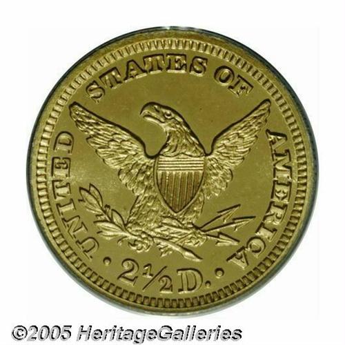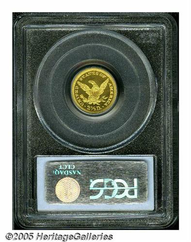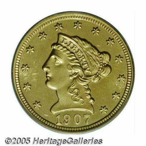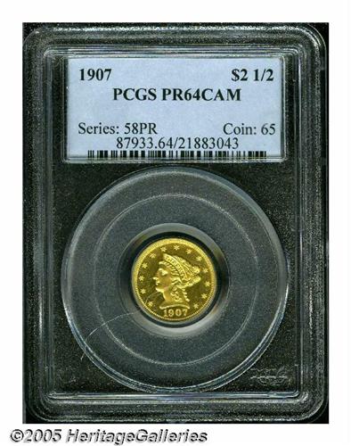 <B>1907<$2 1/2> PR64 Cameo PCGS.</B></I> Proofs of the final-year 1907 Liberty Quarter Eagle are more difficult to locate than those of either the 1900 or 1901 issues. While the Mint struck 154 specimen strikings in the former year, only 65 '07 examples are believed to be currently available to collectors. Deeply set green-gold color backlights orange-gold highlights. The contrast is solid between sharp devices and reflective fields, this despite a little light haziness within the latter. There are, however, no outwardly distracting hairlines, as befits the PR64 designation. Population: 6 in 64 Cameo, 13 have been certified finer with this finish (4/05).