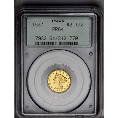 <B>1907<$2 1/2> PR64 PCGS.</B></I> A lovely near-Gem example of this issue, offering considerable cameo contrast and pristine fields. This well produced and well maintained specimen reveals only a few light hairlines and tiny dark toning spots that separate it from a Gem ranking. Housed in an older PCGS green-label holder. An appealing and highly collectible coin. Population: 24 in 64, 30 finer (5/06).