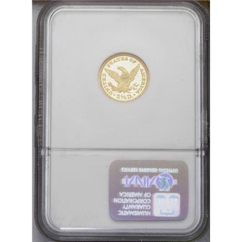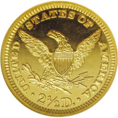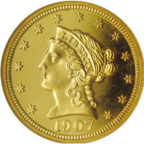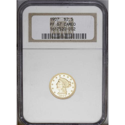 <B>1907<$2 1/2> PR67 Cameo NGC.</B></I> This Superb Cameo Proof is extremely well defined throughout with lustrous devices and deeply mirrored fields. The obverse is brilliant with rich yellow-gold color and the reverse is similar, with a hint of orange toning. The original mintage of the 1907 proof quarter eagle was just 154 coins, and it is generally believed that only about half that number, or a little less, still survive today. Of the 65 or 70 coins that do survive, few are in Superb condition as many have been cleaned, and now exhibit hairlines or other problems. Fortunately, that is not the case with this coin. The surfaces are very nearly perfect. This is one of the finest proof gold coins in the current sale, one that will see considerable interest. Census: 15 in 67, 7 finer (2/06).