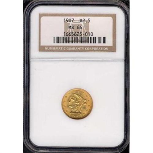 <b>1907 $2.50 Liberty. NGC graded MS66.</b> NGC Pop: 273. A boldly struck gold-surfaced coin whose high-end depth of detail in the strike complements the equally fresh mint bloom. Final year of the Liberty $2.50 design <b>(PCGS # 7859)</b> <i>