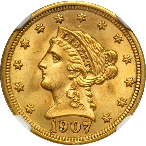 1907 $2.50 Liberty. NGC graded MS-66. Subdued golden coloration can be seen on both sides (PCGS # 7859) .