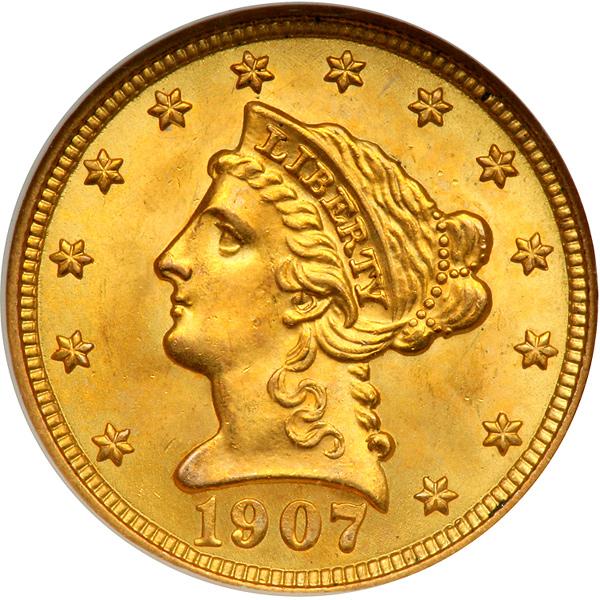 1907 $2.50 Liberty. NGC graded MS-66. Lovely golden toning. A solidly graded, high quality Gem, this coin displays impressive striking definition for a any Liberty quarter eagle of the period. This is to say that the strike is full, including those few hair strands over Liberty's ear which sometimes affect this issue (PCGS # 7859) .