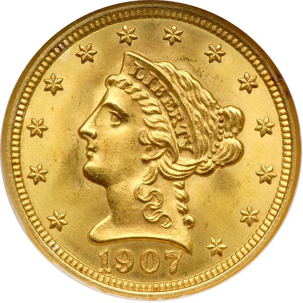 1907 $2.50 Liberty. NGC graded MS-66. This is a nicely struck example exhibiting fine detail to all the high points. Creamy luster and rich orange-gold color with none of the usual tiny alloy spots on the surface. A first-rate Gem (PCGS # 7859) .