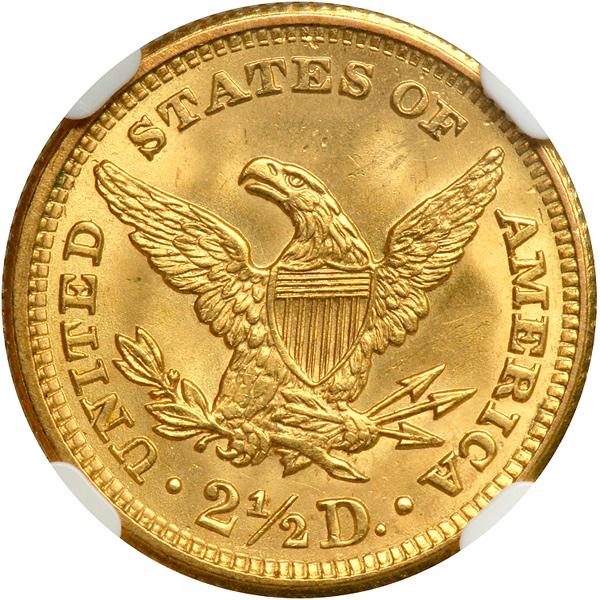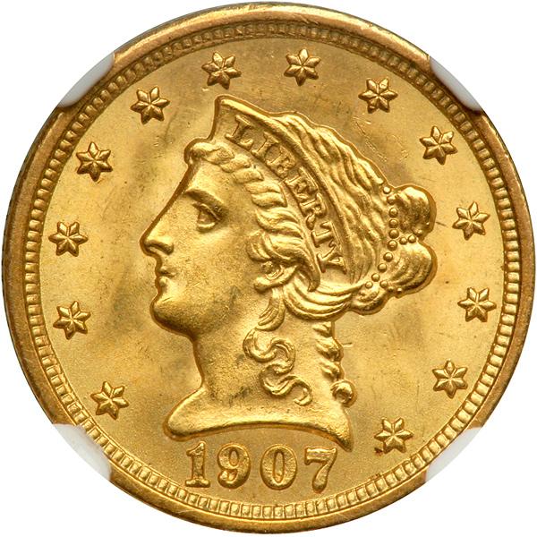 1907 $2.50 Liberty. NGC graded MS-66. This example is quite pleasing with vibrant luster and splashes of almost warm patina on each side. No deviation in the sharp relief seen, either, not even in the stars (PCGS # 7859) .