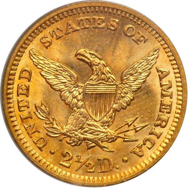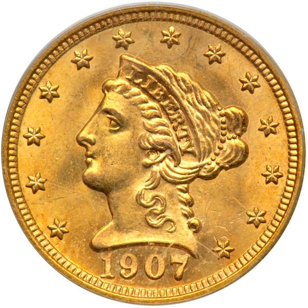 1907. PCGS graded MS-63. Lovely golden toning. The long career of the Liberty quarter eagle came to an end with this issue. We hesitate to use the term "illustrious career" since the quarter eagle served its purpose, did its duty, without much notice or fanfare. All the same, this charming design had been in almost continuous production from 1840 to 1907! (PCGS # 7859) .