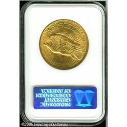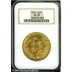 <B>1907 $20 Arabic Numerals MS62 NGC.</B></I> A highly lustrous first year Saint-Gaudens, crisply struck although Liberty's knee and the eagle's breast are not completely defined. A graze is concealed on the eagle's upper right plumage, otherwise quite clean. Lot:9445
