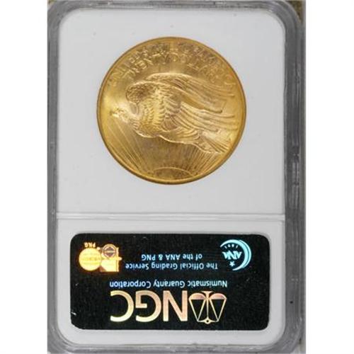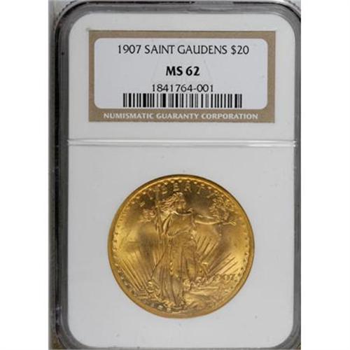 <B>1907 $20 Arabic Numerals MS62 NGC.</B></I> This was the first year of the Saint-Gaudens double eagle design, and the Arabic Numerals variety is much more affordable than the famous High Relief version produced in the same year. This example has satiny mint luster and pleasing coloration with just a few light marks. Some of the design features are softly struck, including Liberty's legs and torso. <BR><BR><B>Coin Engraver:</B> Augustus Saint-Gaudens<BR><BR><b>Shipping:</b> Coins & Currency (<a target="_blank" href="http://www.heritageauctions.com/common/shipping.php">view shipping information</a>)