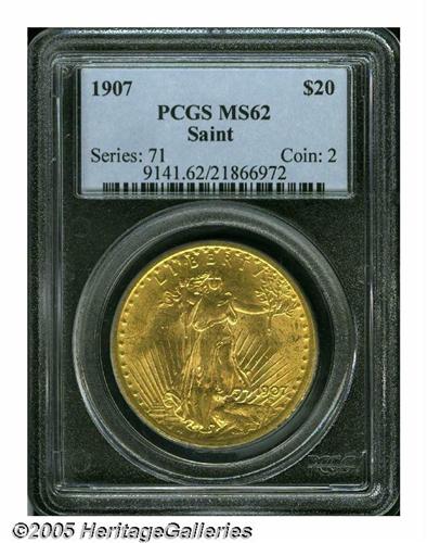 <B>1907<$20> Arabic Numerals MS62 PCGS.</B></I> Peach-gold patina is imbued with subtle greenish undertones, and the design elements are well struck. Lustrous surfaces display some light scattered abrasions scattered over the obverse.