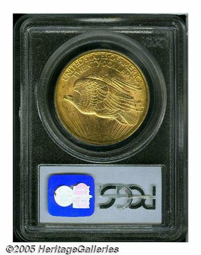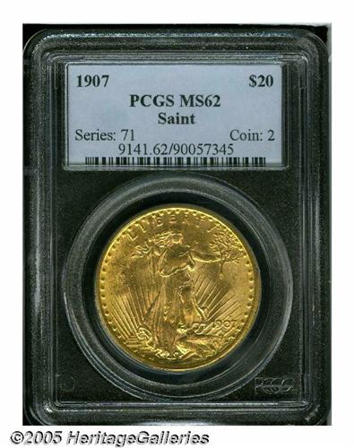 <B>1907<$20> Arabic Numerals MS62 PCGS.</B></I> Well struck for the date, exhibiting a fresh satiny brilliance, attractive color, and numerous small to moderate abrasions on each side of the coin.