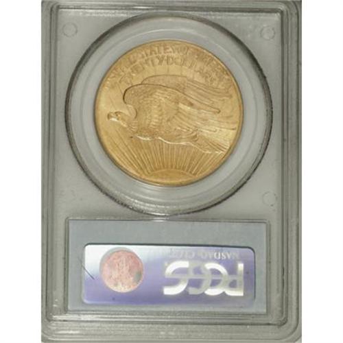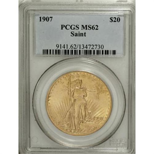 <B>1907 $20 Arabic Numerals MS62 PCGS.</B></I> Shining luster and light orange-gold toning are hallmarks of this Mint State double eagle. Highly desirable as an example of the first year in the Saint-Gaudens series, and much more affordable than the High Relief type from the same year. <BR><BR><B>Coin Engraver:</B> Augustus Saint-Gaudens<BR><BR><b>Shipping:</b> Coins & Currency (<a target="_blank" href="http://www.heritageauctions.com/common/shipping.php">view shipping information</a>)