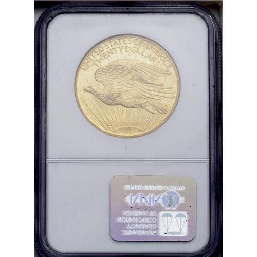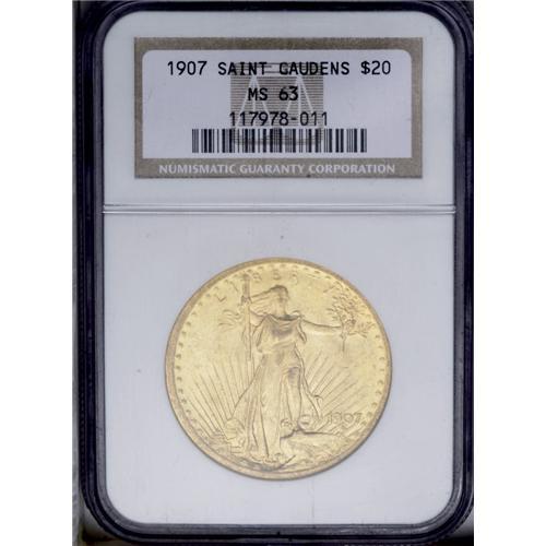 <B>1907<$20> Arabic Numerals MS63 NGC.</B></I> A satiny example of this first-year issue, with bold details and a minimal number of small surface blemishes for the grade.