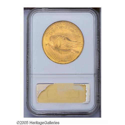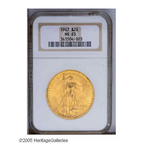 <B>1907<$20> Arabic Numerals MS63 NGC.</B></I> An attractive example of this short-lived design type, issued only in 1907 and 1908 before addition of the Motto on the reverse. Frosty gold surfaces with scattered abrasions and some stacking flatness on Liberty's figure.<BR><I>From The Frank Manthey Collection of Gold Coins.</B></I>