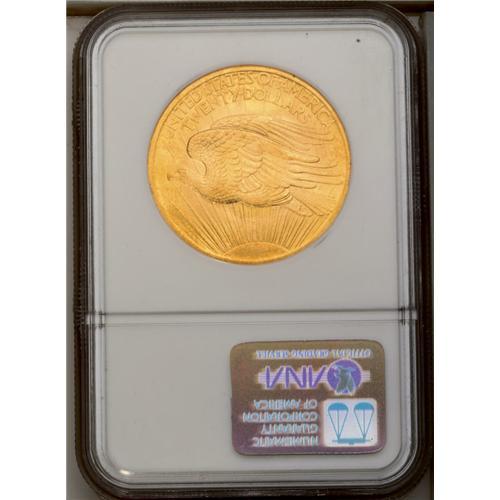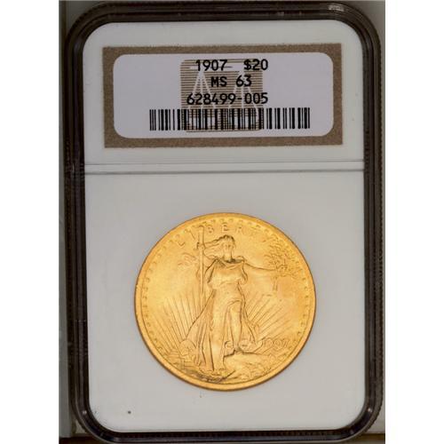 <B>1907<$20> Arabic Numerals MS63 NGC.</B></I> Rich apricot-gold color bathes lustrous surfaces. The design elements are all sharply impressed, though the eagle's thigh feathers are soft. A few minor abrasions preclude a higher grade.