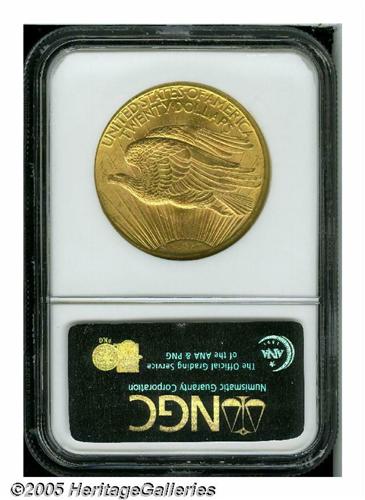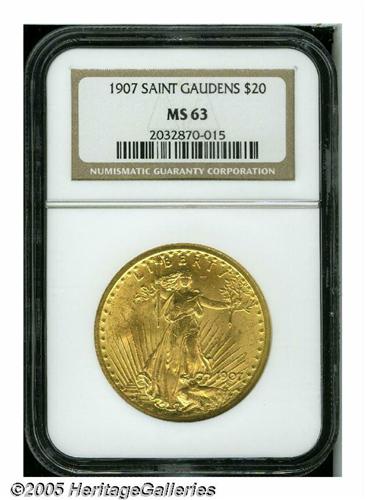 <B>1907<$20> Arabic Numerals MS63 NGC.</B></I> The first year of issue for the majestic Saint-Gaudens design, and a popular date among collectors, as it is much more affordable than the famous High Relief variety produced this same year. This example has softly frosted mint luster and a decent strike, with just a few light marks, and one noticeable abrasion on Liberty's upper left (facing) thigh.