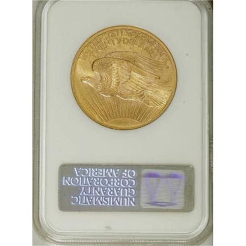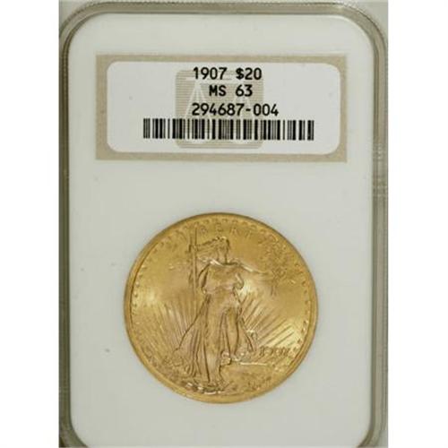<B>1907 $20 Arabic Numerals MS63 NGC.</B></I> This first-year type coin has radiant sun-gold luster, and the strike on the Capitol building is razor-sharp. Generally smooth, but a shiny mark is present near the base of the olive branch. Encapsulated in a former generation holder.<BR><BR><B>Coin Engraver:</B> Augustus Saint-Gaudens<BR><BR><b>Shipping:</b> Coins & Currency (<a target="_blank" href="http://www.heritageauctions.com/common/shipping.php">view shipping information</a>)