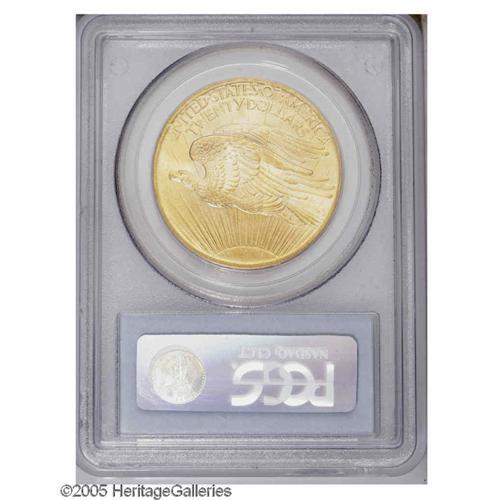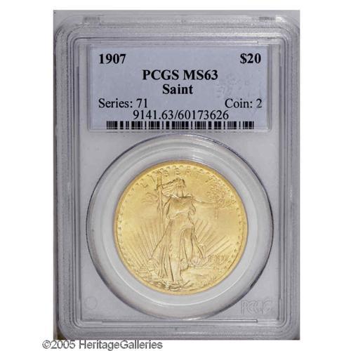 <B>1907<$20> Arabic Numerals MS63 PCGS.</B></I> An attractive example of this short-lived design type, issued only in 1907 and 1908 before addition of the Motto on the reverse. Frosty gold surfaces with scattered abrasions and some stacking flatness on Liberty's figure.<BR><I>From The Diamond Collection, Part One.</B></I>