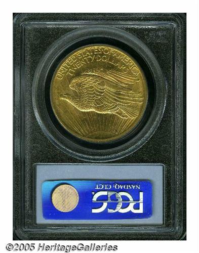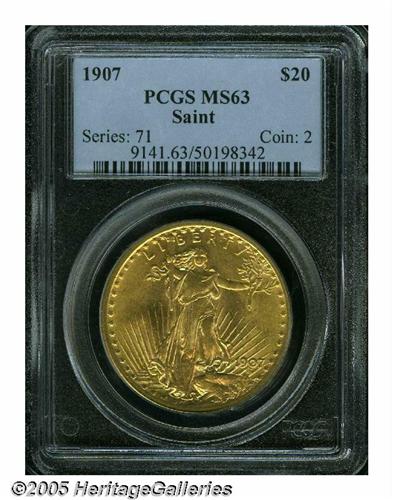 <B>1907<$20> Arabic Numerals MS63 PCGS.</B></I> Somewhat softly struck and rather lightly abraded, for an MS63, with rich orange-gold coloration and pleasing, full satin luster. The first year of issue for Saint-Gaudens' majestic design and a popular date among collectors, as it is much more affordable than the famous High Relief variety produced this same year.
