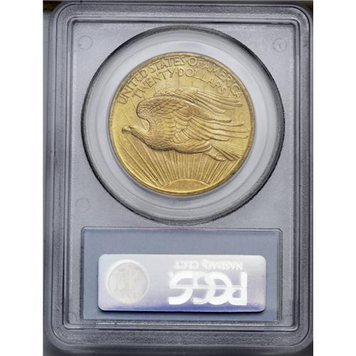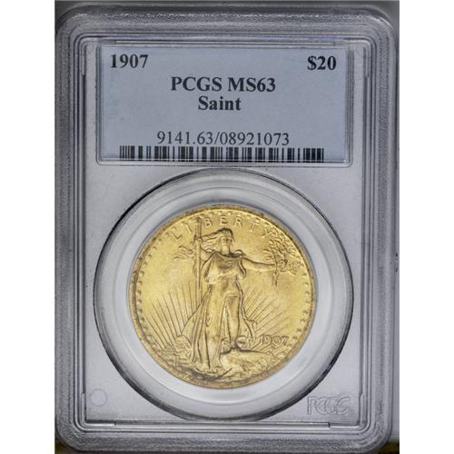 <B>1907<$20> Arabic Numerals MS63 PCGS.</B></I> This satiny, straw-gold example is lustrous and lightly abraded, with yellow-green and pink toning. Slight striking weakness is noted on Liberty's lower legs, and on the lower part of the eagle's torso.